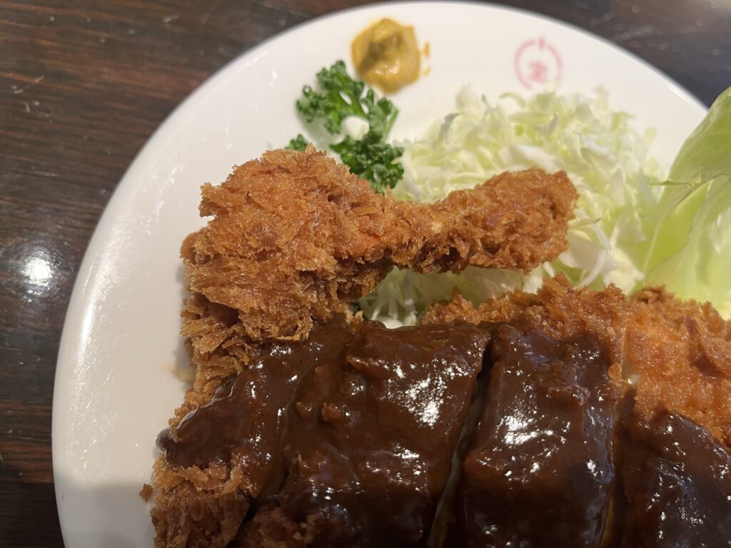 チキンカツは端が骨付きになっています。カリカリに揚げた衣に、お肉はかなり分厚いのに柔らかいです。