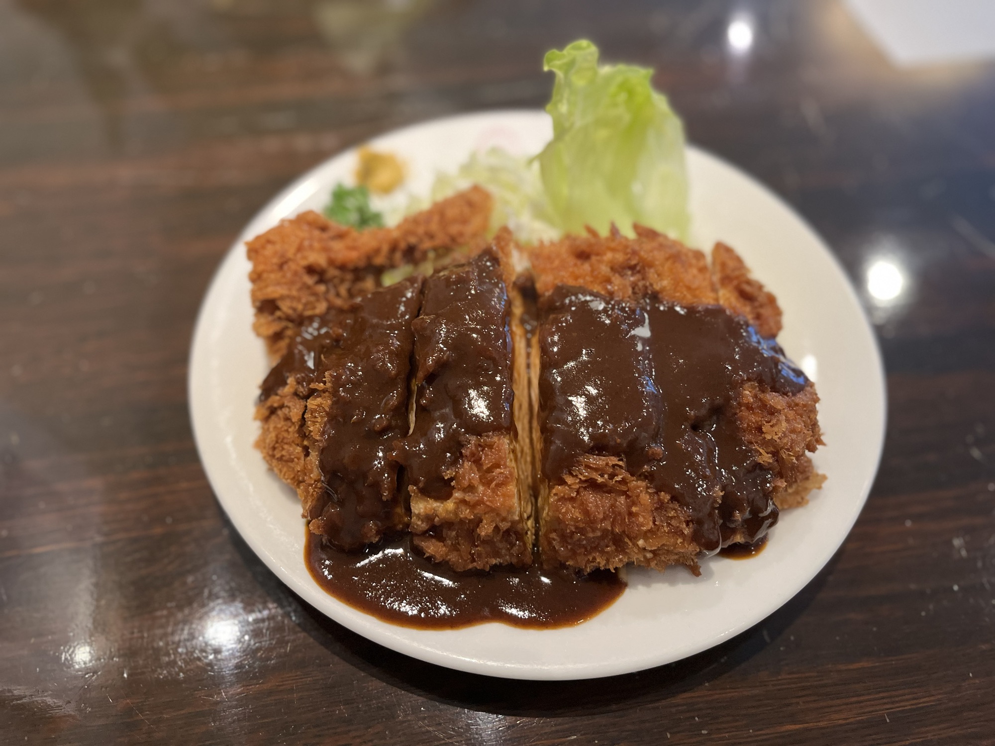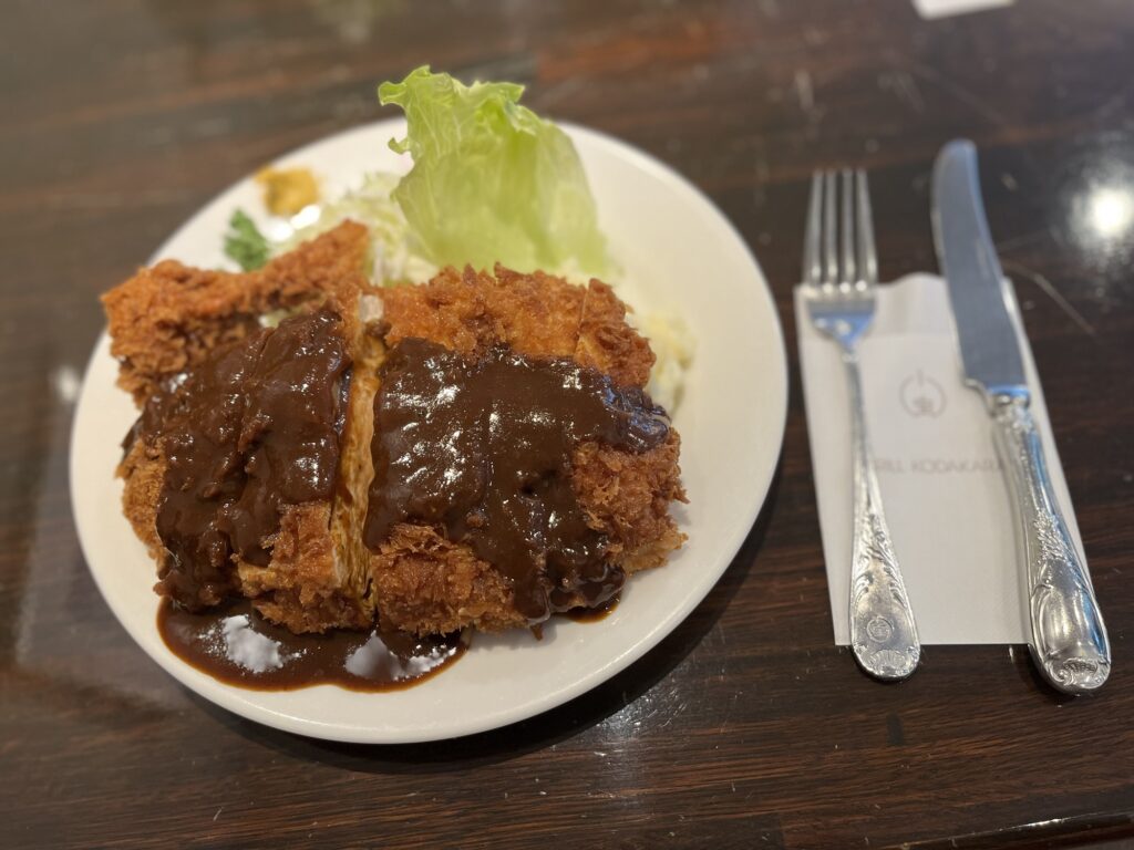 小宝さん特製の濃厚なドビソース(デミグラス)がかかっています。添えられているからしがピリッとして、一緒に食べるととても美味しいです。