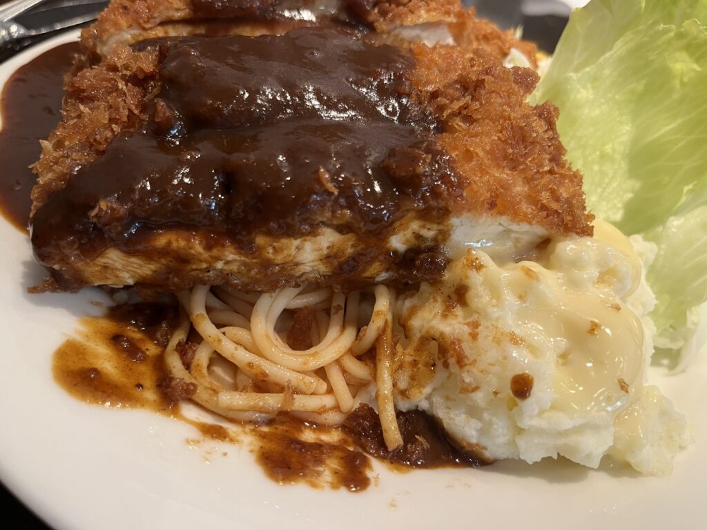 千切りキャベツにポテトサラダが添えてあり、カツの下にはパスタが隠れています……!!さらにすごいボリュームです。そしてライスもなかなかの量でした。