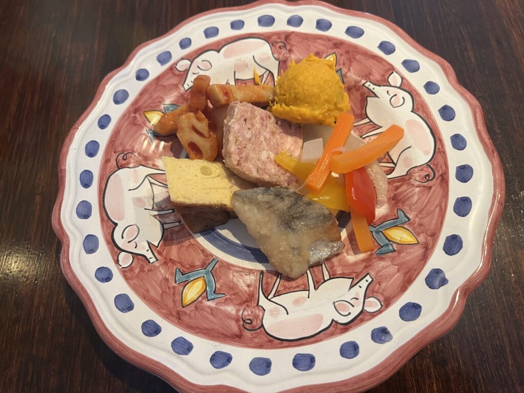 まずは前菜。可愛いお皿に6種類も盛ってあります!少しずつ色々な味が楽しめるのはとてもいいですね。