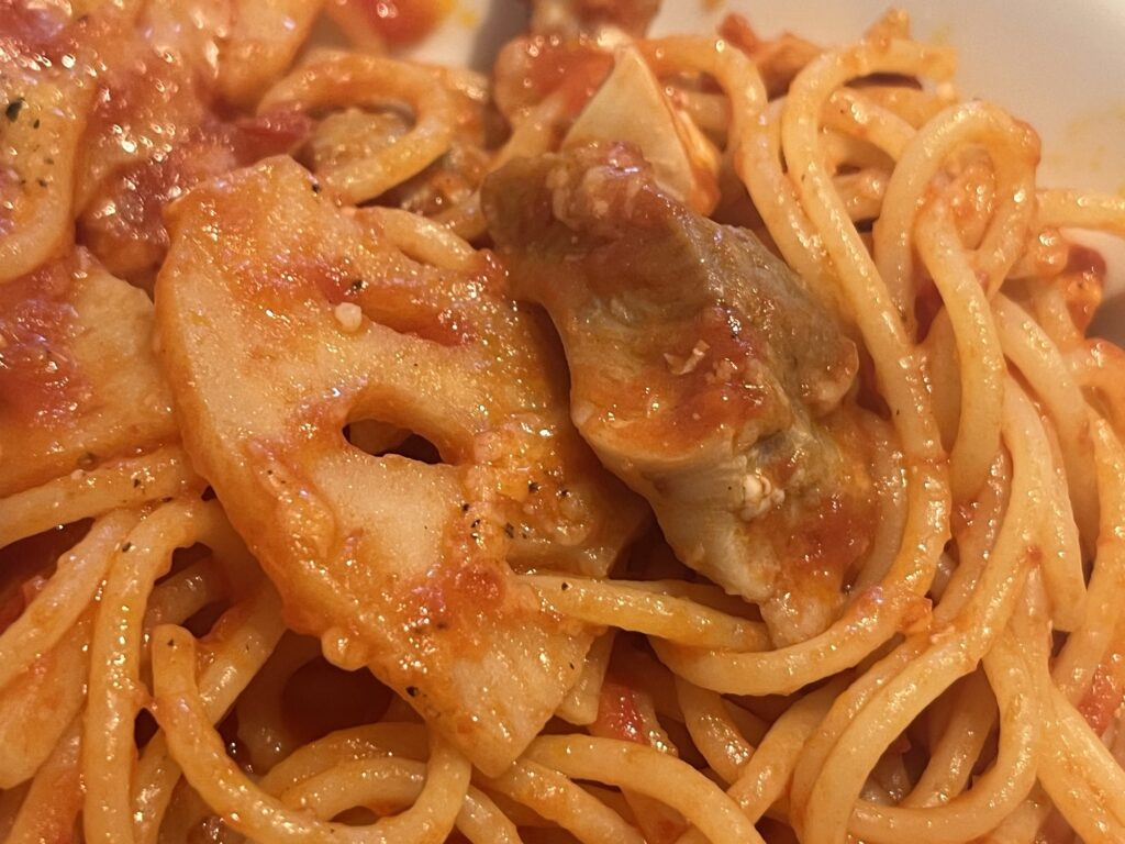 私はパスタの『チキンとレンコンのトマトソース』にしました。