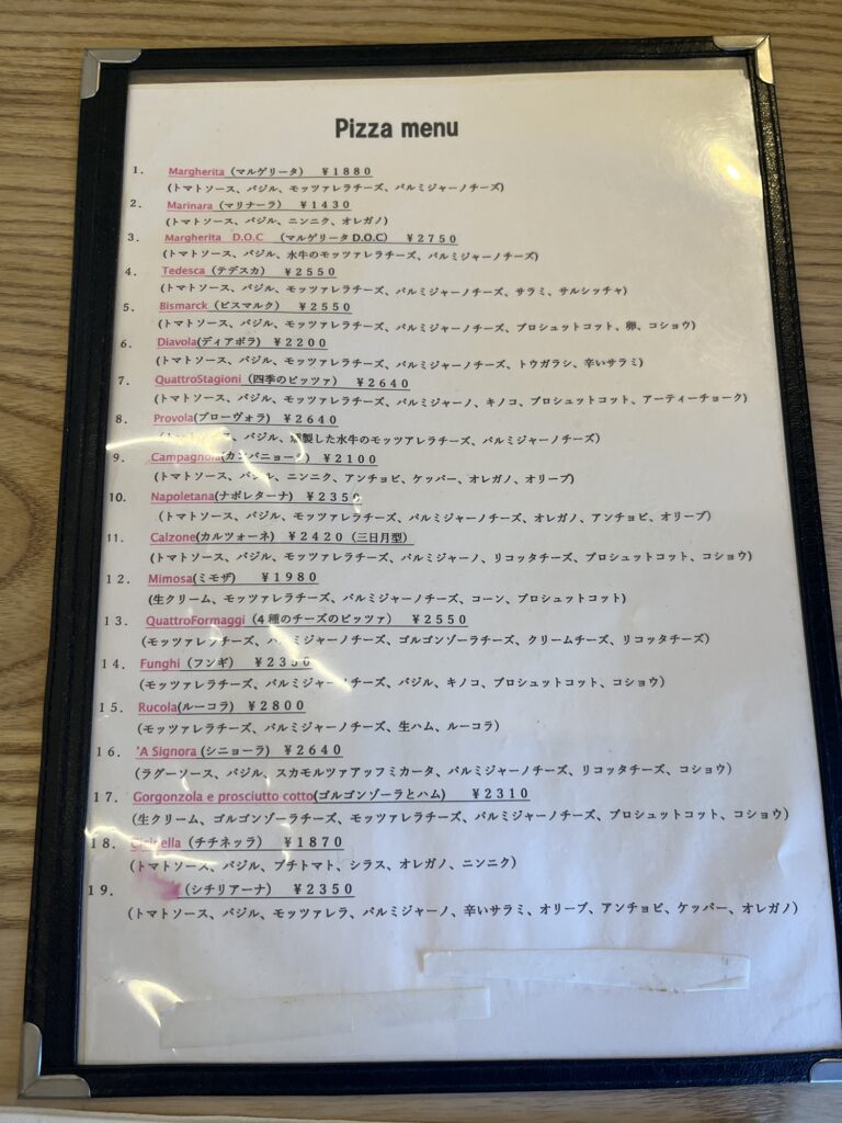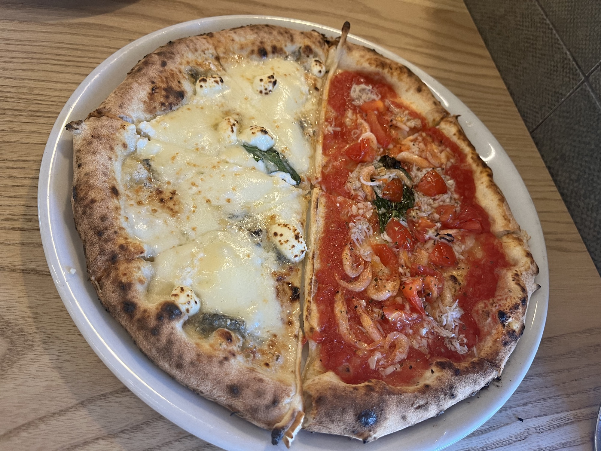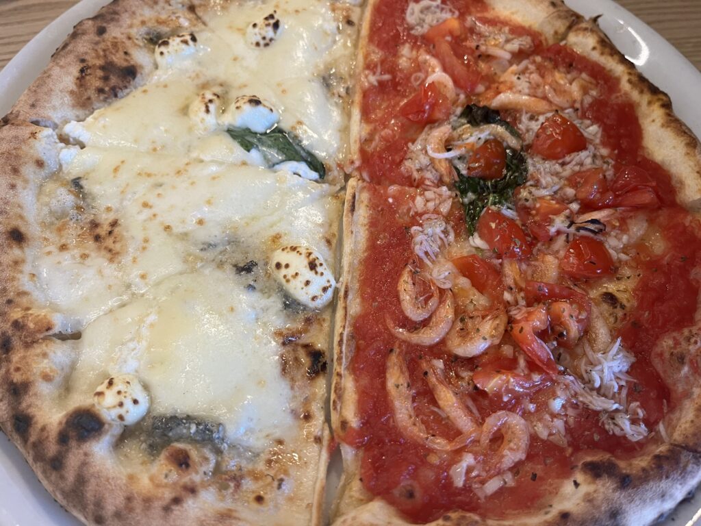 ピッツァはマルゲリータとハーフ&ハーフの二枚を注文しました。ハーフはメニュー表に書いてないのですが、していただけます。ピッツァの単品の値段の半額×2枚分+200円追加になります。