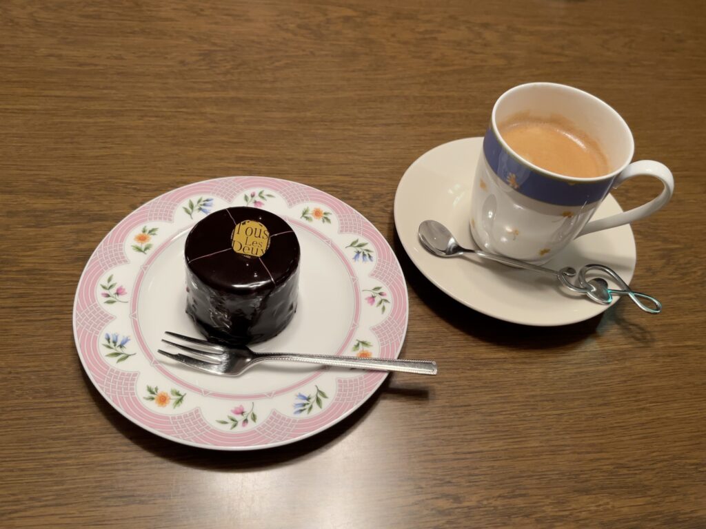 ケーキはとても迷いましたが、今回はベルナッションとホットコーヒーを注文しました。