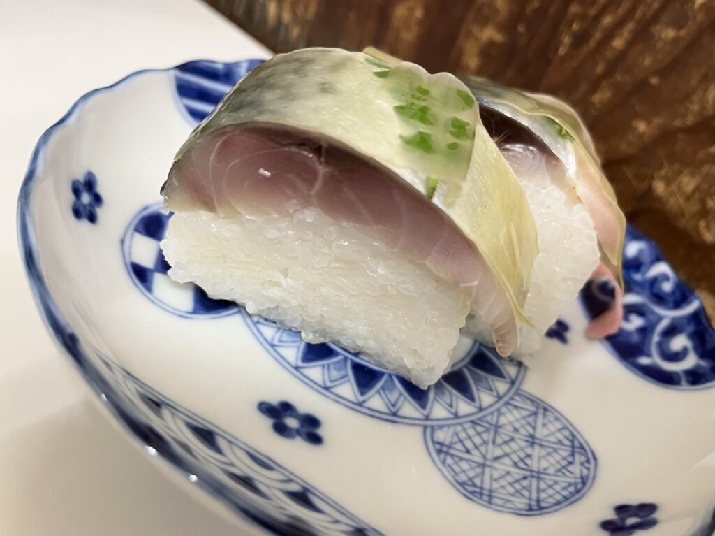 鯖寿司は肉厚で、臭みも全くありません。上にのっている木の芽もいい香りです。