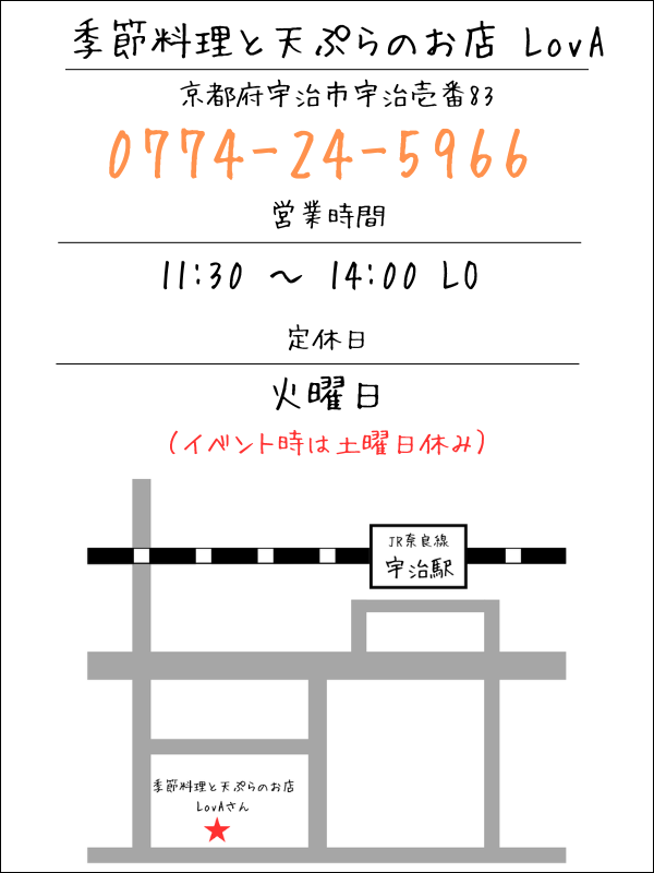 JR宇治駅から徒歩4分ほどの場所にある季節料理と天ぷらのお店 LovA(ロバ)さんに伺いました。