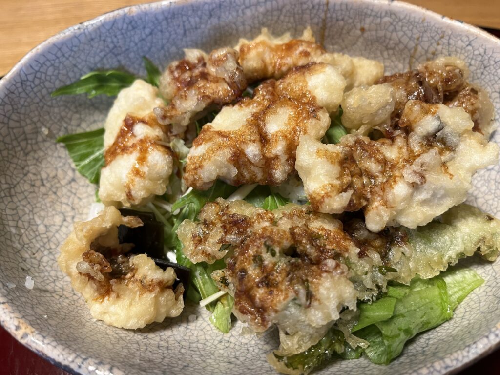ご飯の上にたくさんの鱧の天ぷらがのっています。サクッと軽く揚げてあるので、ペロリと食べられます。タレは濃いめで甘辛い感じでした。